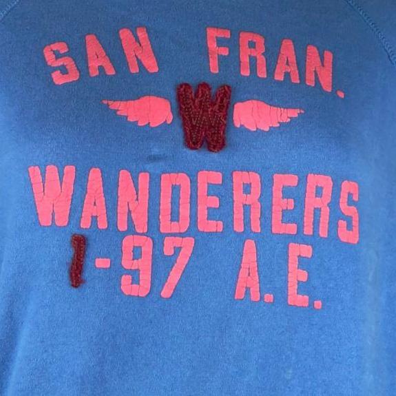 Trendy lightweight blue sweater with the San Fran Wanderers featured on the front.
