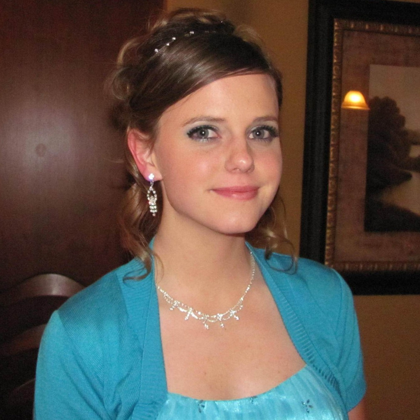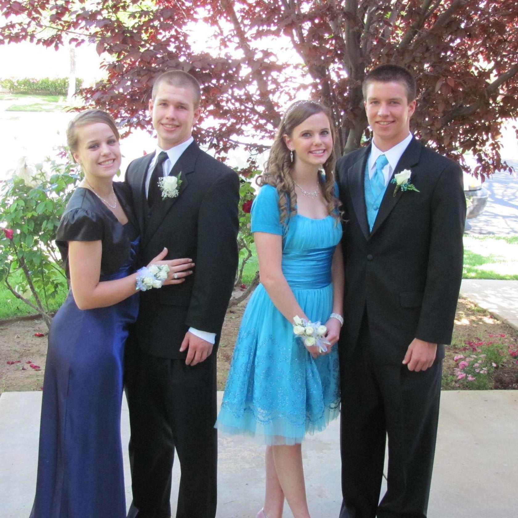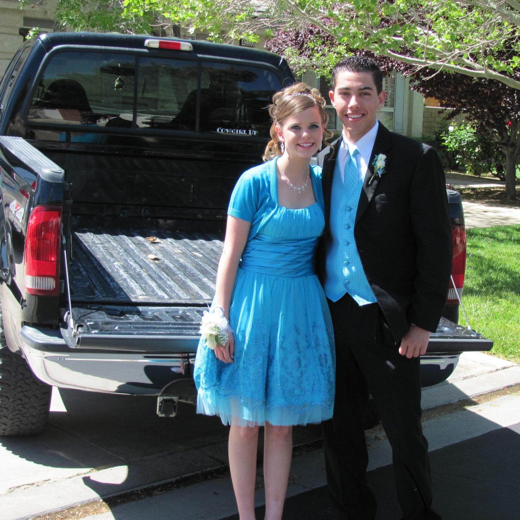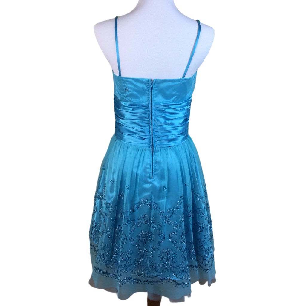 Tiffany wore this eye-catching dress to two proms in 2010! Dazzling spaghetti-strap with  empire-waist dress with extra-wide shirred satin self-fabric sash and embellished floral and glitter skirt overlay. Feel like a real princess! Teal shrug included!